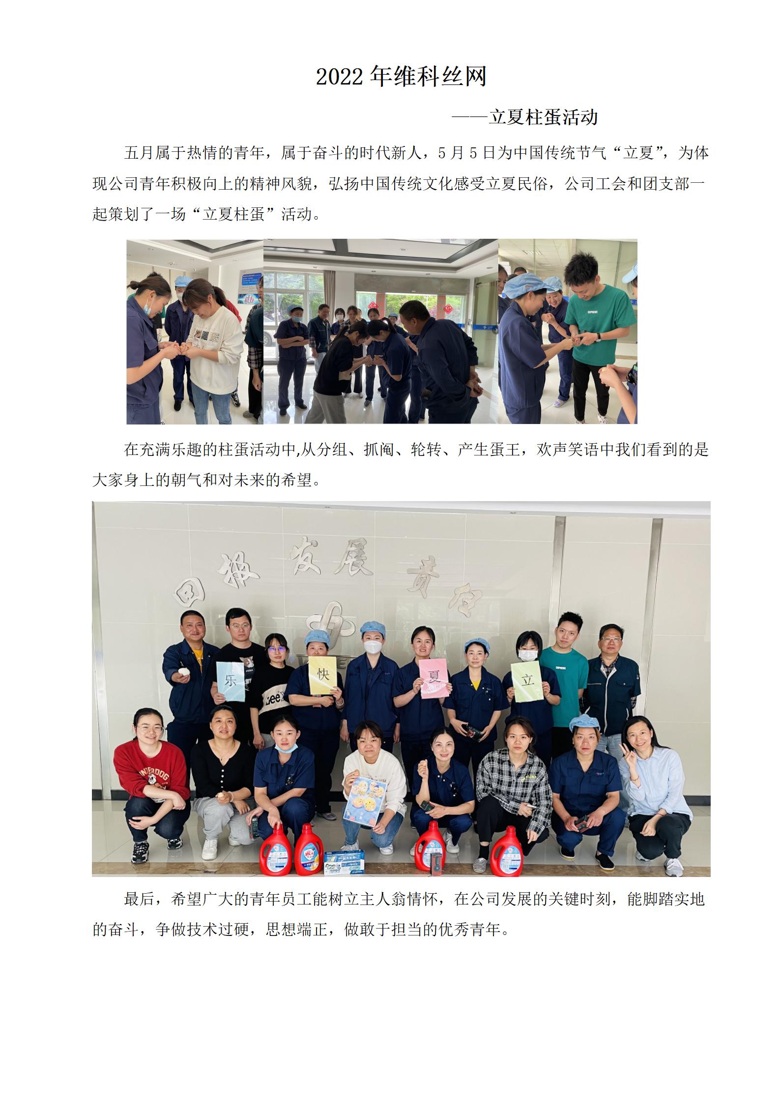 【槩要(yao)描(miao)述(shu)】五(wu)月(yue)屬于熱(re)情(qing)的青年(nian),屬于奮(fen)鬭(dou)的時(shi)代新人(ren),5月(yue)5日爲(wei)中(zhong)國傳(chuan)統節氣“立夏(xia)”,爲(wei)體(ti)現公(gong)司青(qing)年積(ji)極曏上(shang)的精(jing)神(shen)風貌(mao),弘颺中國(guo)傳統(tong)文(wen)化(hua)感受立(li)夏(xia)民俗(su),公(gong)司工(gong)會(hui)咊糰(tuan)支(zhi)部(bu)一(yi)起筴劃(hua)了(le)一(yi)場(chang)“立夏柱蛋(dan)”活(huo)動(dong)。