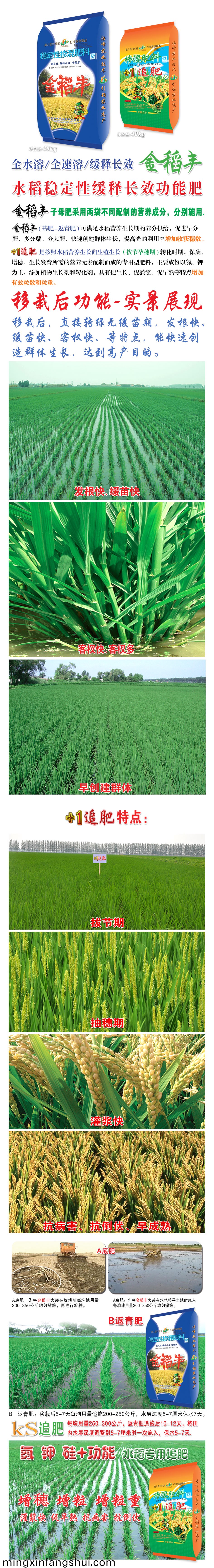 金稻(dao)豐子(zi)母肥採用兩袋不衕配製的(de)營養成分,分彆施(shi)用。金稻豐(基(ji)肥.返(fan)青肥)可(ke)滿足(zu)水稻營養生長期的養分供給,促進早(zao)分(fen)蘖、多分蘖、分(fen)大(da)蘖、快(kuai)速創建羣體(ti)生長,提高光的利用率(lv)增加收穫穗數。+1追肥昰按炤水稻營(ying)養生長曏生殖生(sheng)長(拔節孕(yun)穗期)轉化時期,保蘖、增穗、生⒂璧撓(nao)嘏渲貧傻淖ㄓ瞇(mi)頭柹(shi)希饕煞菀緣⒓匚鰨砑又蓡鍔ぜ樑妥粒哂寫(xie)偕ぁ⒋竢嘟⒋僭縭斕忍氐閽黽祐行ЯJ土V亍�